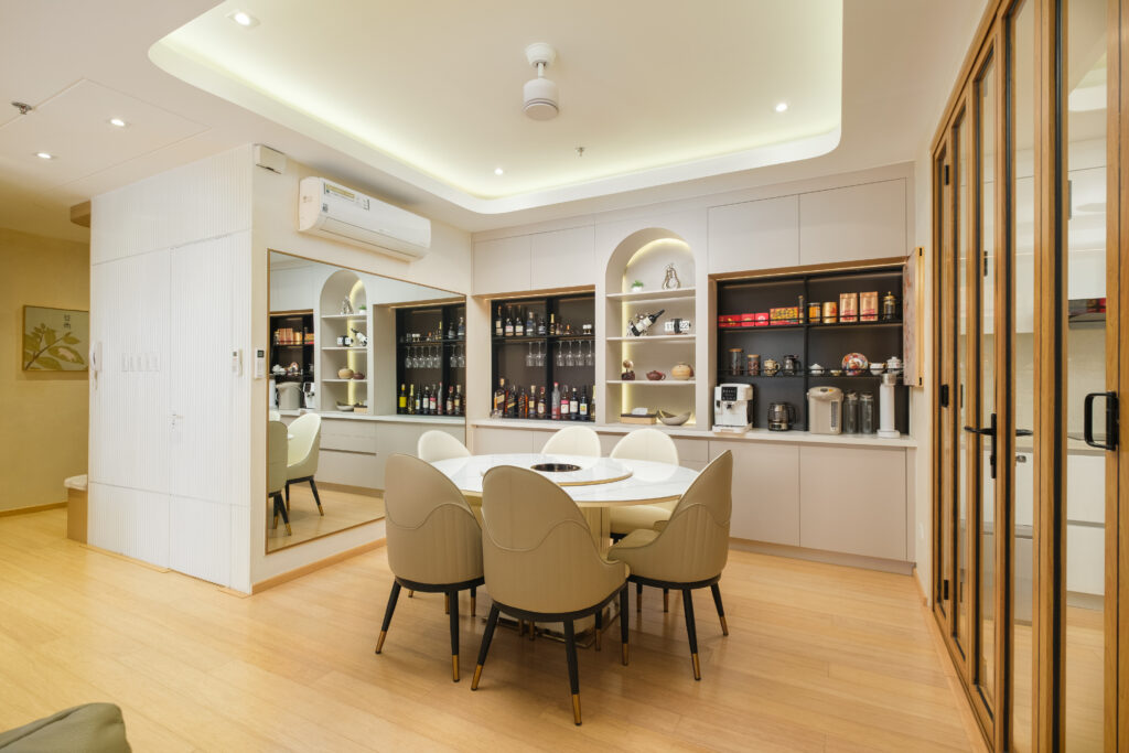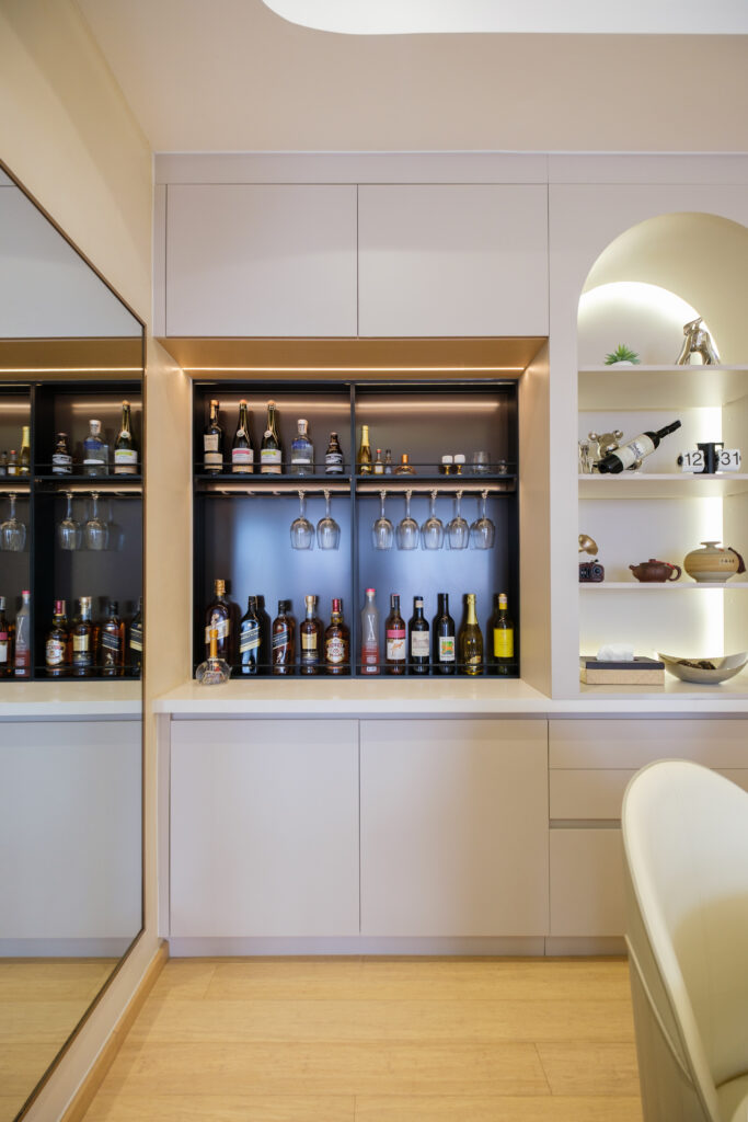 Beyond function, the refreshment bar enhances the aesthetics of the dining space. Its taupe finish complements the Modern Bamboo flooring, while its clean lines and rounded corners echo the overall minimalist theme of the condo. Subtle design details—like soft-close drawers and layered storage—make it both practical for everyday family use and elegant enough for entertaining.