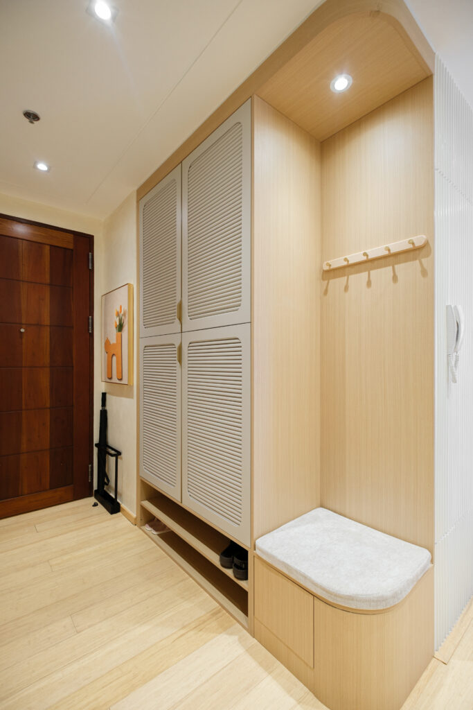 A highlight of this renovation is the modular shoe cabinet—custom-built to fit up to 100 pairs of shoes. It also features a built-in cushioned seat, blending comfort with functionality. This type of custom modular storage solution is ideal for urban homes where space efficiency is key.