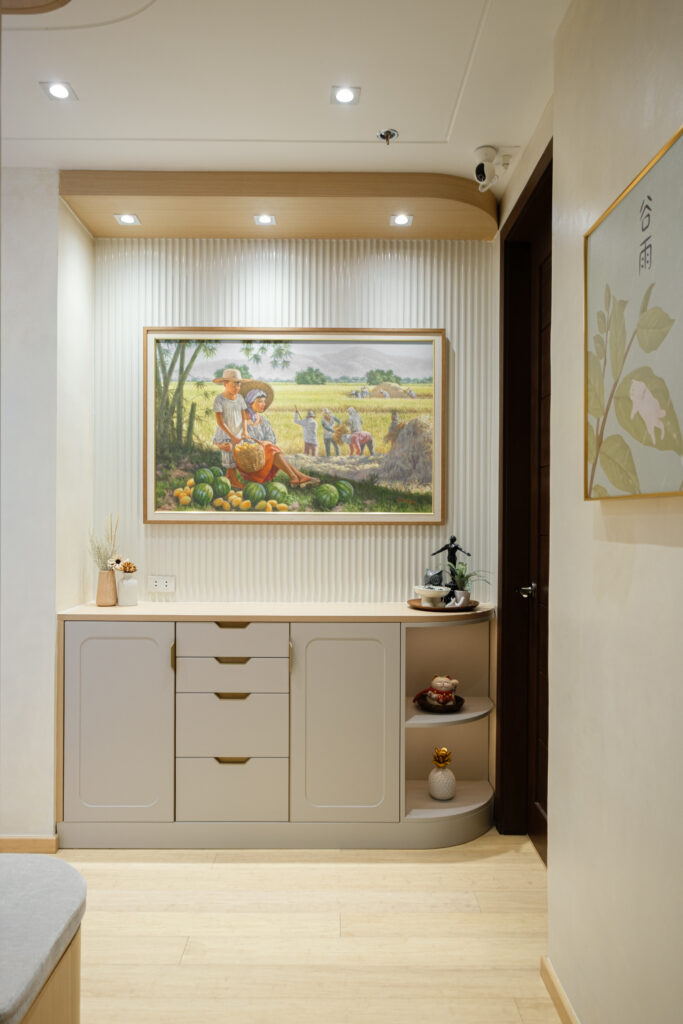 The entryway features a modular foyer cabinet designed by CXF Design Center, perfectly complementing a beautiful painting by Filipino artist Joselito Barcelona. This functional yet artistic setup makes the foyer both practical for storage and visually welcoming.