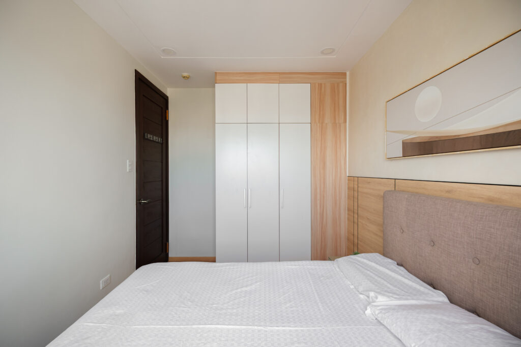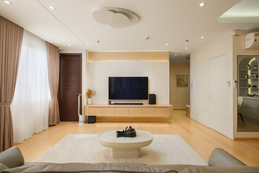 The homeowners wanted a minimalist condo design in the Philippines with clean lines, soft curves, and natural tones. Light wood finishes dominate the interiors, paired with practical modular storage solutions. Since the family has two toddlers, safety was a priority—rounded cabinet corners were chosen to keep the design child-friendly without sacrificing aesthetics.