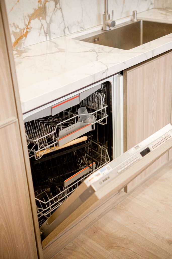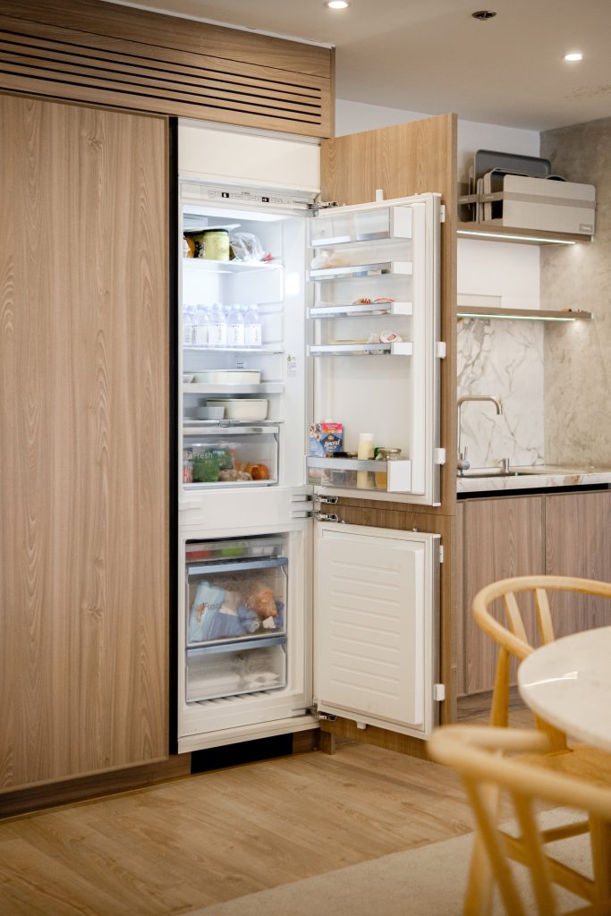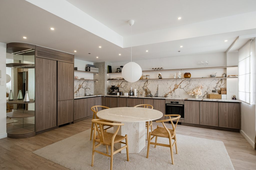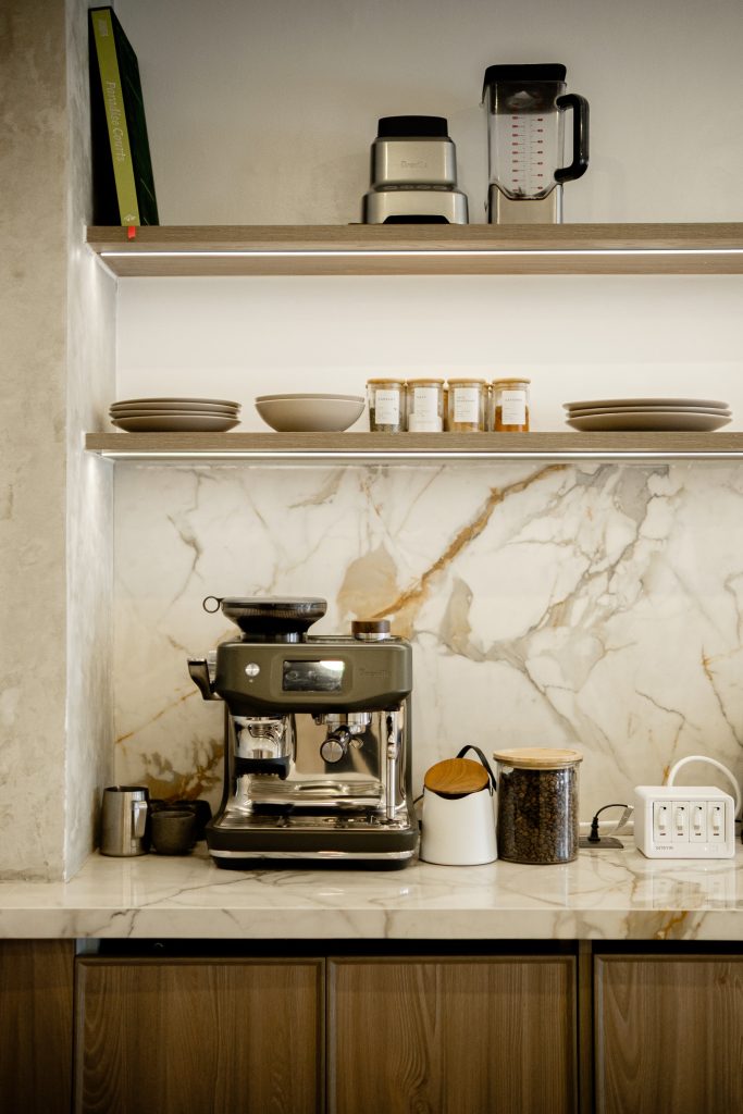 The kitchen is wrapped in warm natural wood cabinetry and anchored by a striking marble backsplash whose soft gold and grey veining creates a sense of quiet sophistication without overwhelming the space. Open shelves with integrated lighting turn everyday objects into curated accents, making the room feel personal and lived-in rather than staged. Every appliance is positioned intentionally to preserve visual serenity. The refrigerator is fully integrated behind cabinetry, the dishwasher disappears into the millwork, and even the washerâdryer is hidden beneath the counter behind matching doors. Kylie can manage day-to-day routines without ever breaking the kitchenâs visual flow.