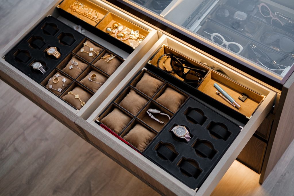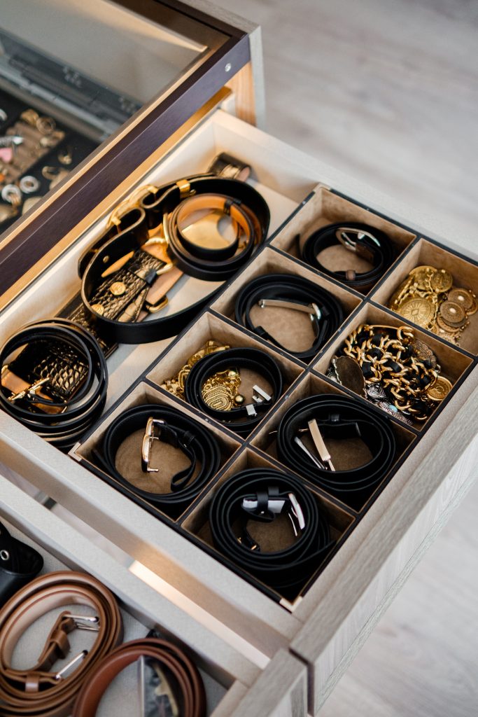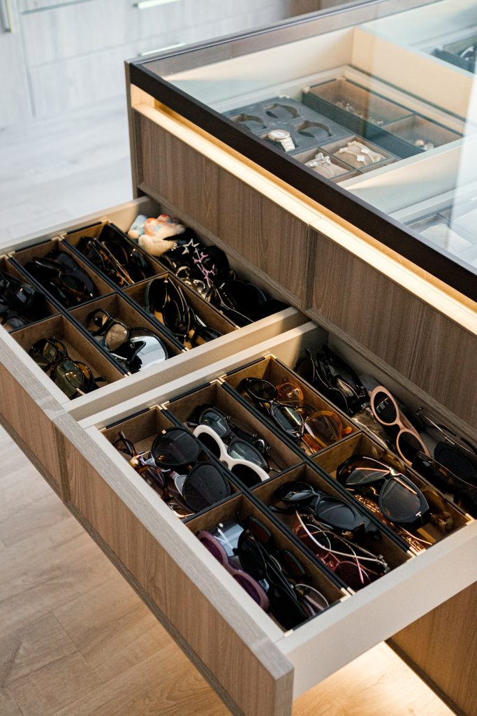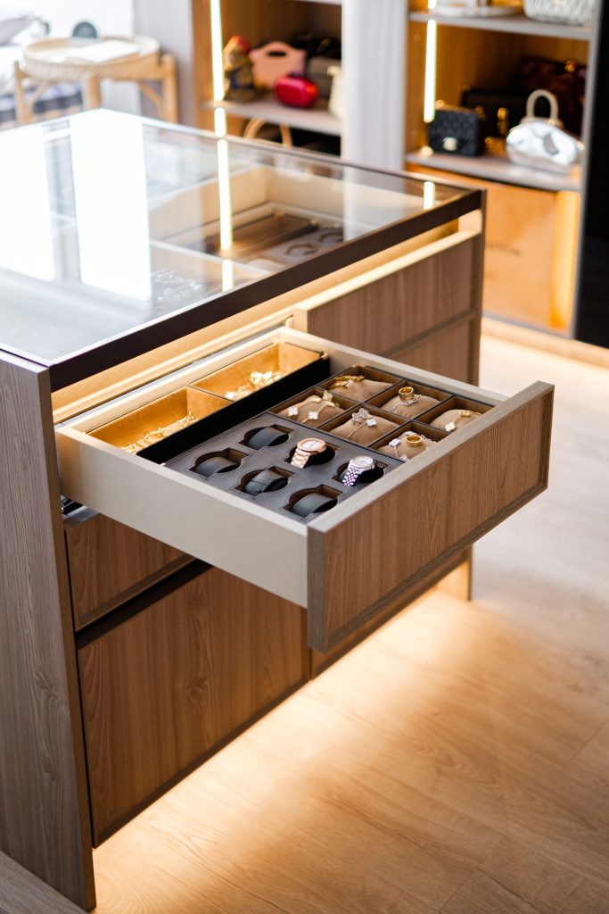 The centerpiece of the closet is a custom glass-top island that turns personal belongings into a curated gallery. Each drawer is lined to protect delicate finishes and arranged with compartments tailored to Kylieâs lifestyle. Jewelry sits in velvet trays, rings are displayed in rows, sunglasses are separated to avoid scratching, and belts are stored in coiled compartments to preserve structure and hardware. What could easily become clutter becomes a calm archiveâan organized inventory of memories, outfits, travels, and milestones. In a profession where wardrobe is part of identity, this space gives Kylie clarity, not chaos.