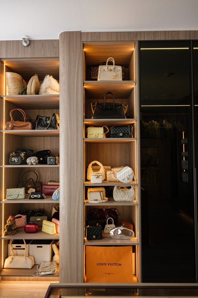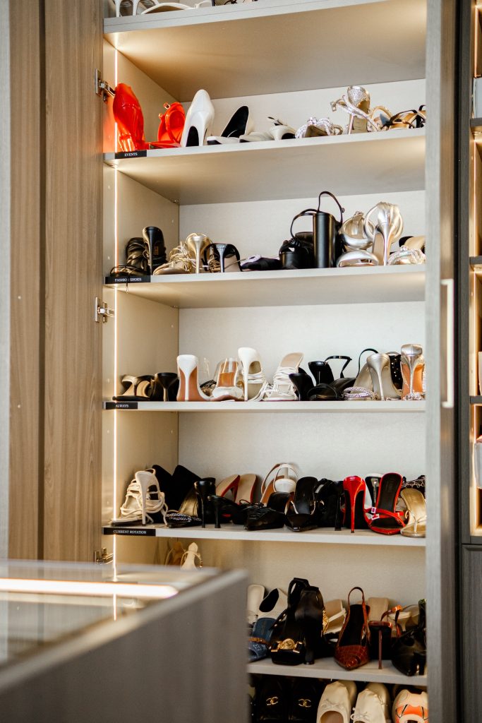 Along one wall, Kylieâs handbag collection is displayed on softly lit open shelves. The spacing was intentionalâeach piece has room to breathe rather than being stacked or crowded. Rounded vertical edges soften the built-ins, giving them a sculptural presence in the room. Across from the bags, a dedicated shoe cabinet organizes her pairs by purpose and frequency of use: event heels, everyday favorites, seasonal styles, and current rotation. Lighting is placed in the corners of the shelves to illuminate silhouettes without washing out the textures or colors. This system helps Kylie choose quickly while keeping every pair accessible and protected.