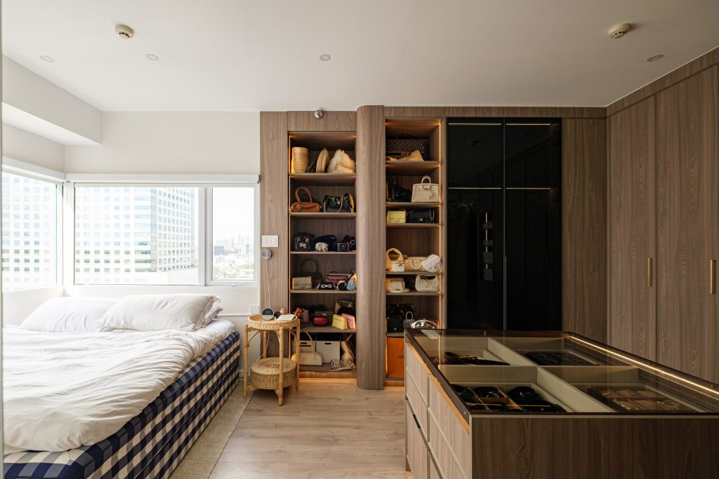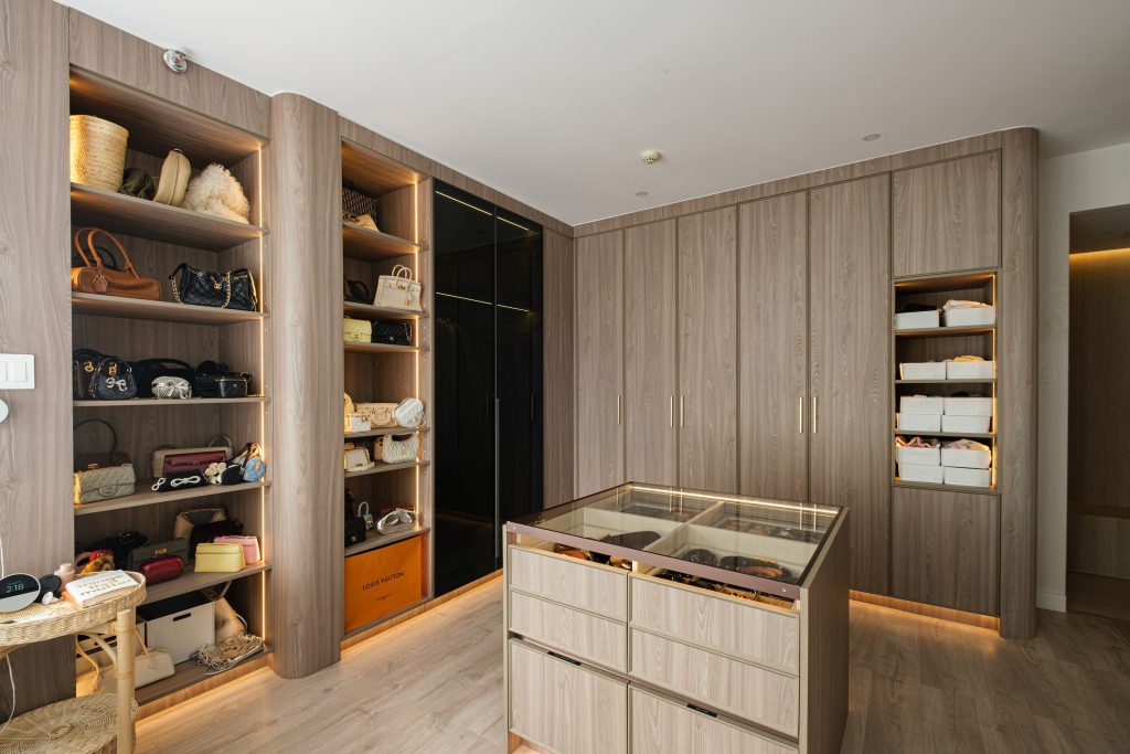 This approach extends naturally into Kylieâs walk-in closet, which was crafted to feel like her own private boutique rather than a traditional storage room. A glass-topped wardrobe island displays accessories in soft-lined compartments, transforming belts, sunglasses, watches, and jewelry into a curated collection. The act of choosing an outfit becomes a peaceful ritual rather than a frantic search. Her handbag display sits on softly lit shelves with rounded edges, giving each piece room to breathe, highlighting textures and silhouettes in a way that feels intentional and artful.