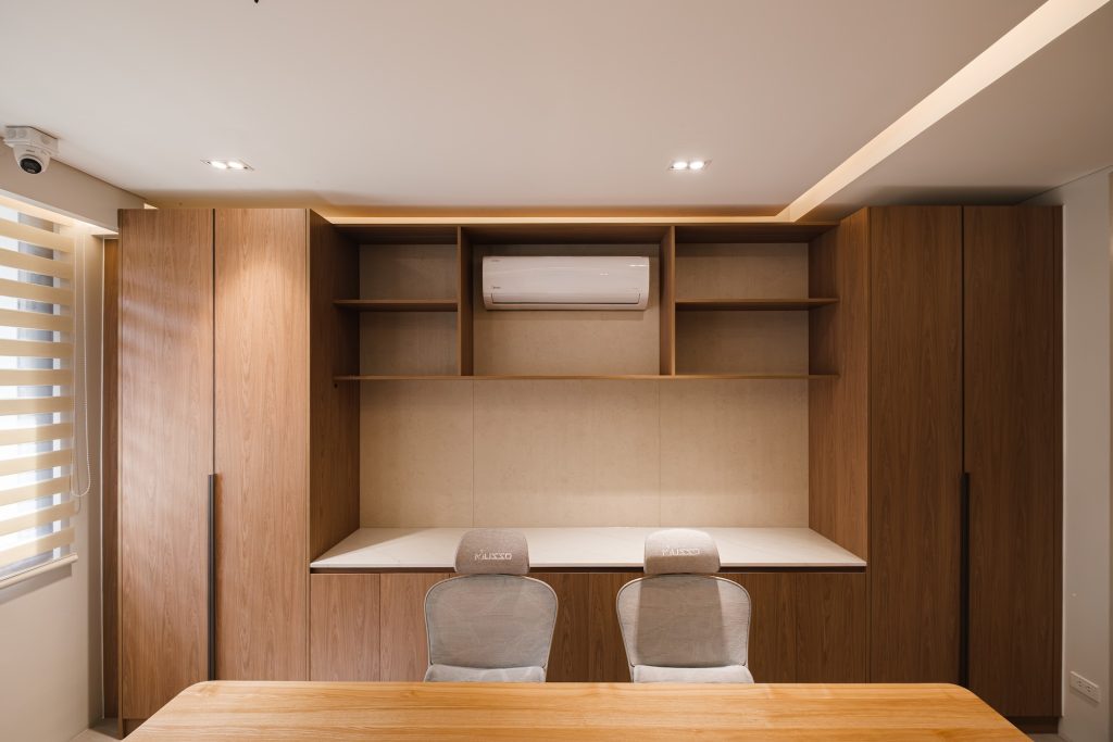 A long built-in desk accommodates multiple workstations, making the room ideal for collaborative work or meetings. The warm wood finish paired with subtle lighting details creates an environment that feels calm, focused, and professional.