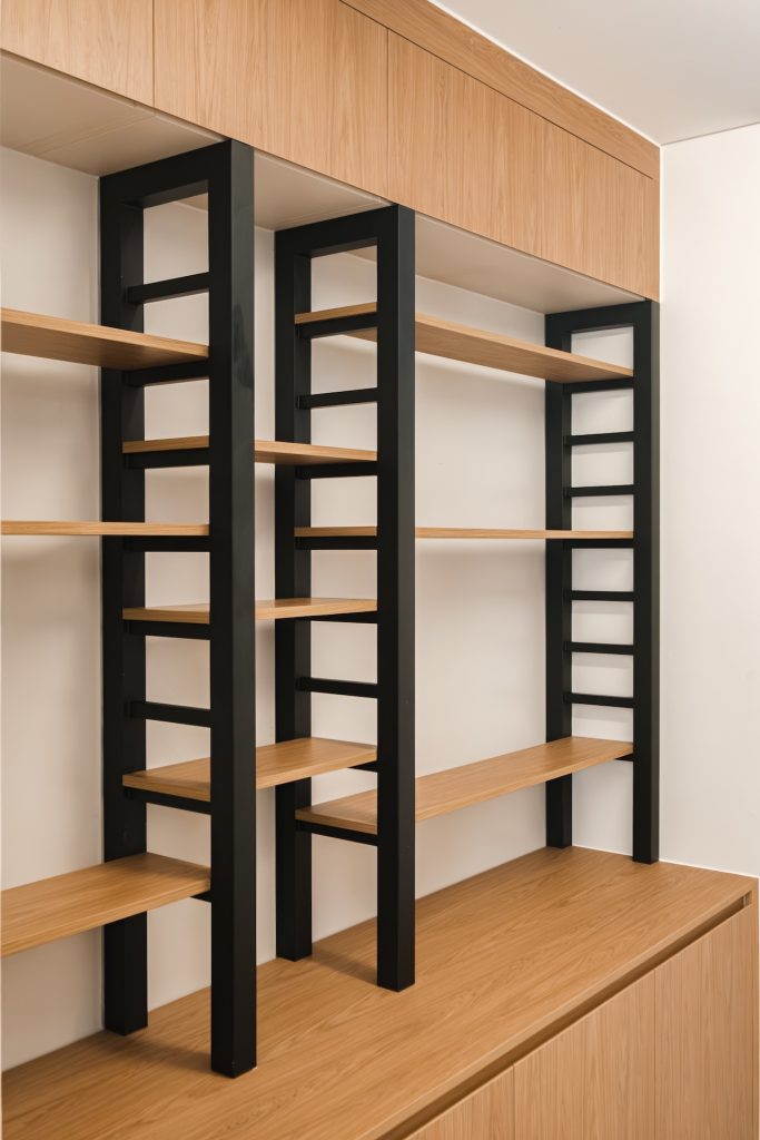 The home office was designed as a dedicated workspace that combines practicality with warmth. Custom floor-to-ceiling cabinetry provides generous storage while maintaining a streamlined appearance. Open shelves offer easy access to frequently used items, while closed cabinets keep clutter hidden.