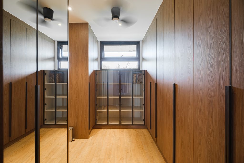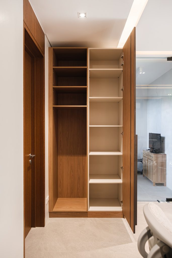 The walk-in closet was designed to provide both practical storage and refined presentation. Full-height wardrobes maximize vertical space, offering ample room for clothing and accessories.