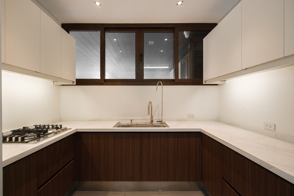 The kitchen renovation focuses on durability, cleanliness, and efficiency. Stainless cabinetry provides a sleek and hygienic solution that is easy to maintain and ideal for heavy kitchen use.
